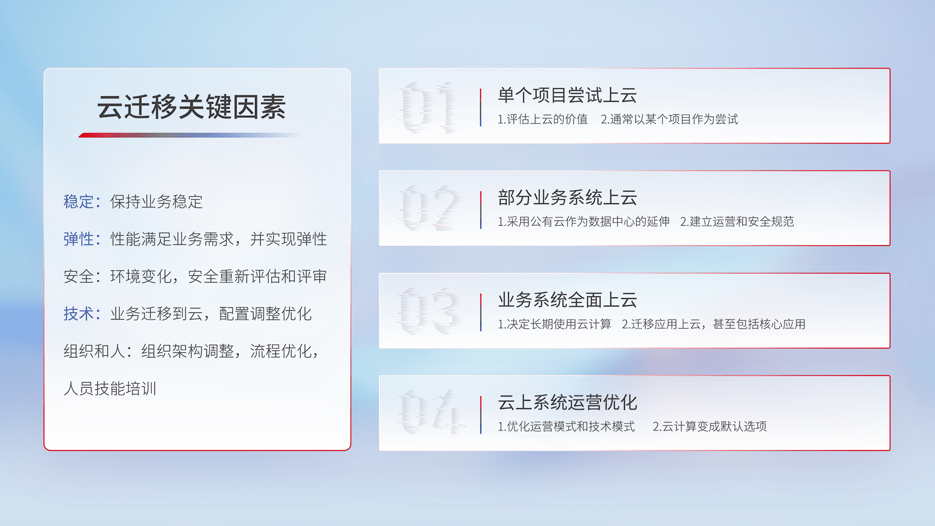 结合实际业务,,从规划设计、、、、云平台选型、、、、云原生改造、、数据迁移、、、、集成交付,,迁移全过程为客户识别最佳上云路径,,,做好风险识别管理,,设计网络架构、、身份权限、、、、安全审计合规、、、操作审计、、、日志审计、、、、监控告警策略、、、、多站点容灾设计等,,,,对云上基础设施进行整体规划,,提升IT治理水平,,以满足弹性、、、高可用、、、、高性能的需求。。。。