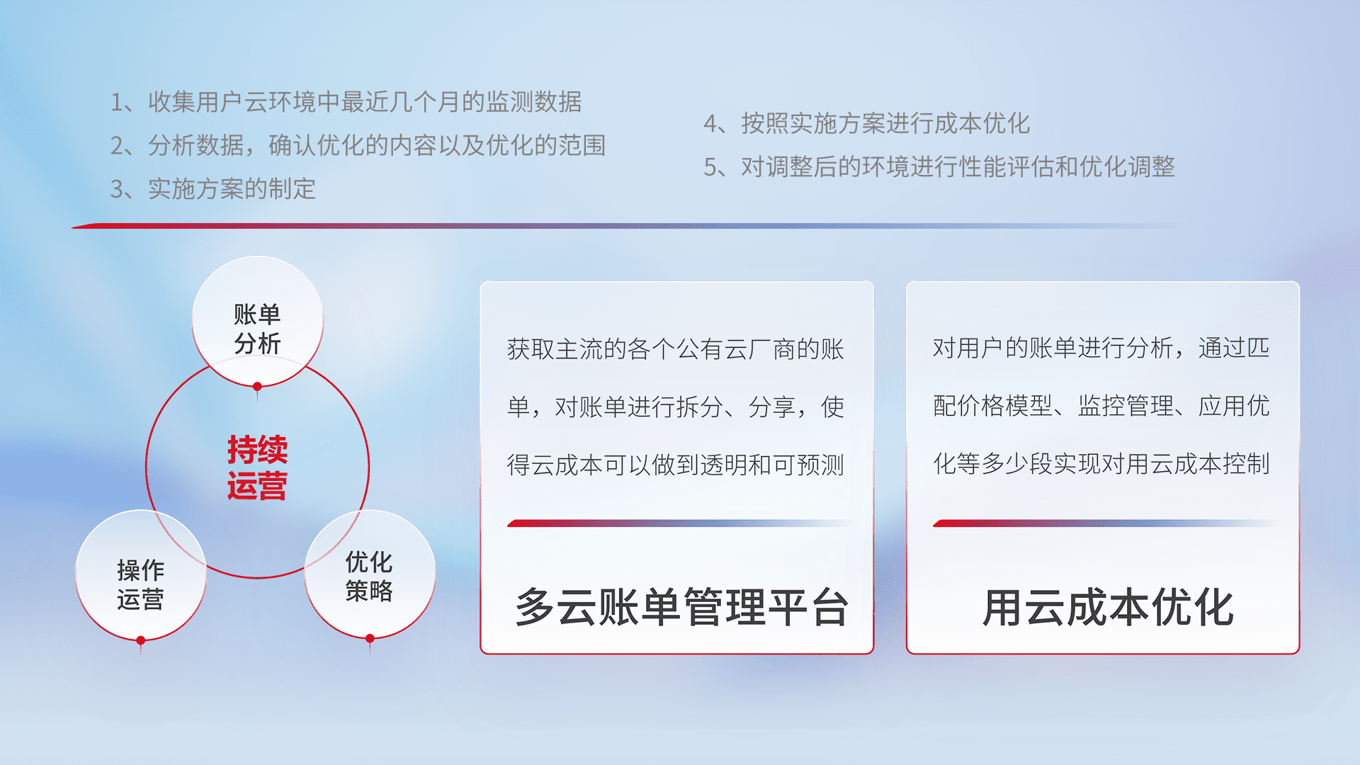 通过多云纳管,,以统一的资源数据模型把客户的云资源进行抽象和封装,,进而实现对多云资源的统一操作,,,保障云资源管理的可靠性、、稳定性与可用性。。。。量身定制化运维内容,,,配置、、、、开发运维、、、、补丁管理、、备份、、监控、、、、认证和访问管理、、审计和日常巡检等,,,,保障在用云过程中的可靠度,,,,稳定度以及高可用率。。。